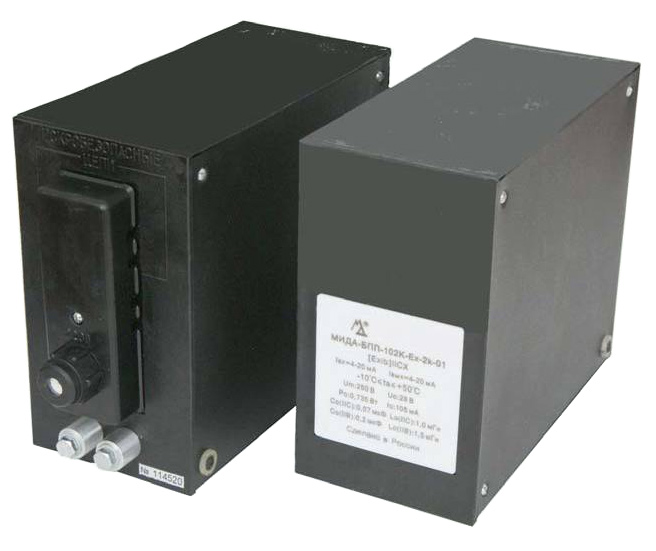 Блоки МИДА-БПП-102-Ех и МИДА-БПП-102К-Ех с входными искробезопасными электрическими цепями уровня «ib» имеют маркировку взрывозащиты [Exib]IIC X, соответсвуют требованиям ГОСТ Р 51330.0-99, ГОСТ Р 51330.10-99 и предназначены для установки за пределами взрывоопасных зон помещений и наружных установок.